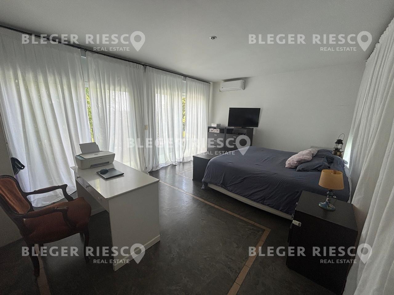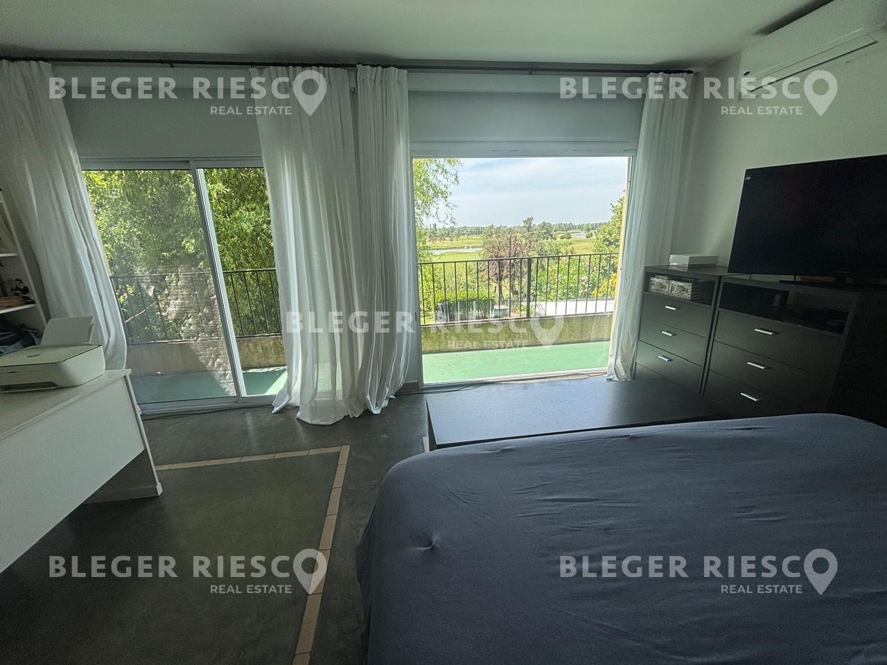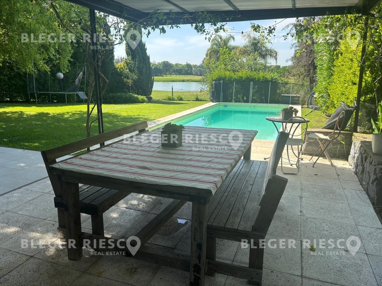 Sobre hemroso lote con vista al golf, casa de estilo clasico desarrollada en dos plantas. Pb recepcion, lviing comedor, cocina semi integrada, lavadero, despensa y baño de servicio. Dormitorio o play con baño en suite y cama marinera de una plaza. Toilete de recepción Galeria, parrilla, piscina. Planta alta, 2 dormitorios, el principal con cama king size y toda la vista abierta a las lagunas del golf. Baño completo compartido Placard en ambos, y splits en todos los ambienttes. La casa cuenta con una hermosa piscina, y jardin parquizado. El barrio cuenta con amenities varios.